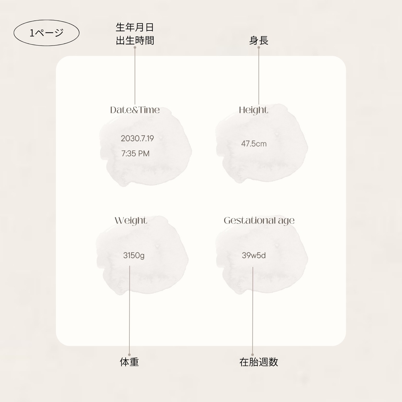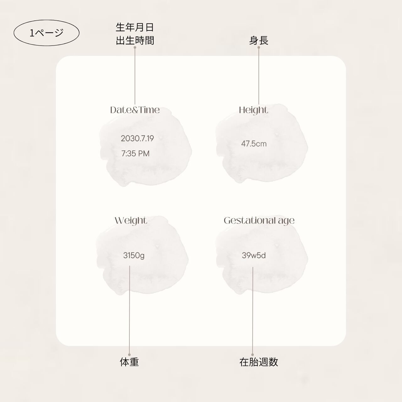 ●出生時の情報:生年月日(西暦)、出生時間(AM/PM表記)、身長、体重、在胎週数