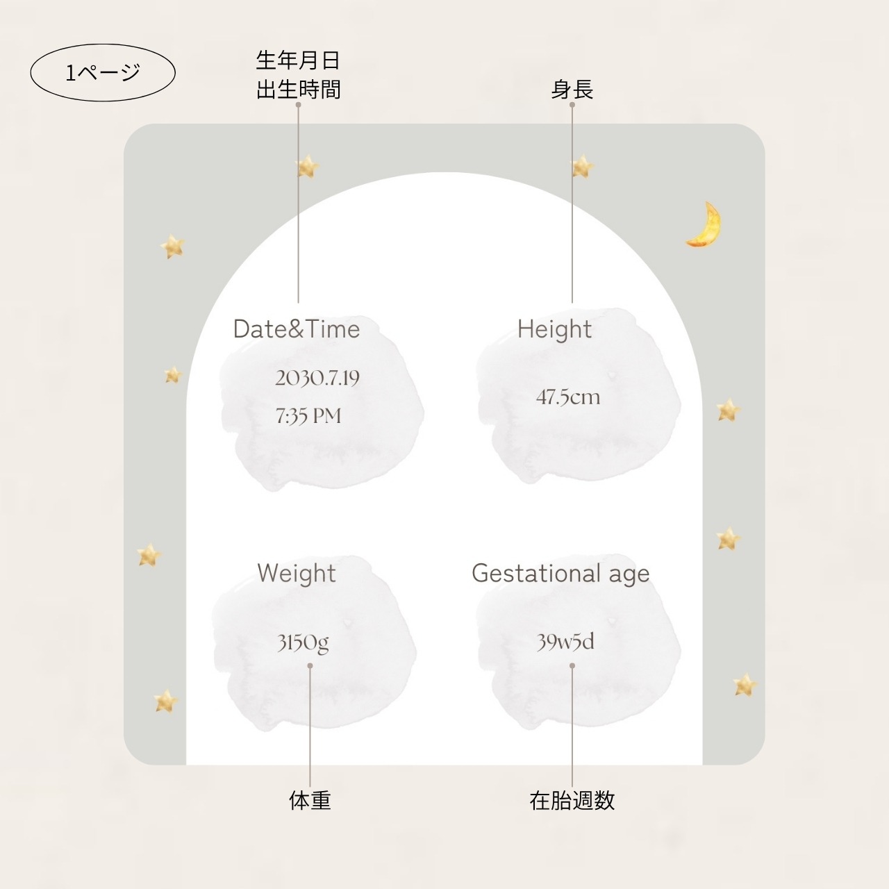 ●出生時の情報:生年月日(西暦)、出生時間(AM/PM表記)、身長、体重、在胎週数